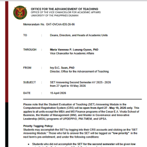 Memo No. OAT-OVCAA JARC 22-17: SET Answering for First Semester AY 2022-2023 from 23 November 2022 to 21 December 2022 Posted on November 21, 2022
